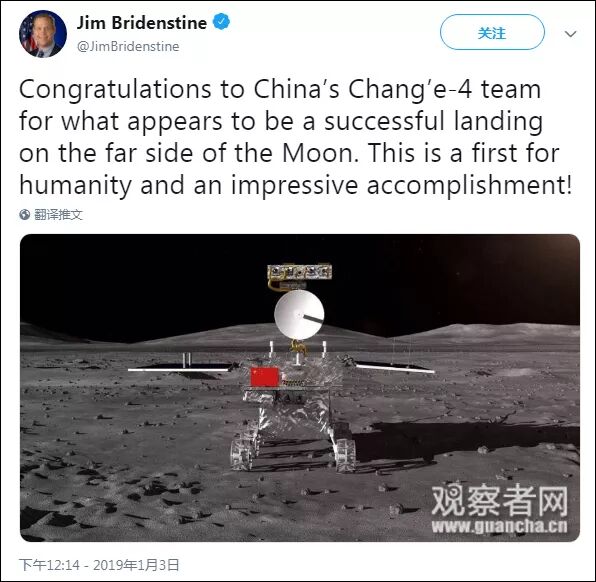 嫦娥四号登陆消息传出后,美国太空探索技术公司(Space X)CEO马斯克,和美国国家航空航天局(NASA)局长布里登斯廷(Jim Bridenstine),也在社交媒体上发来祝贺。