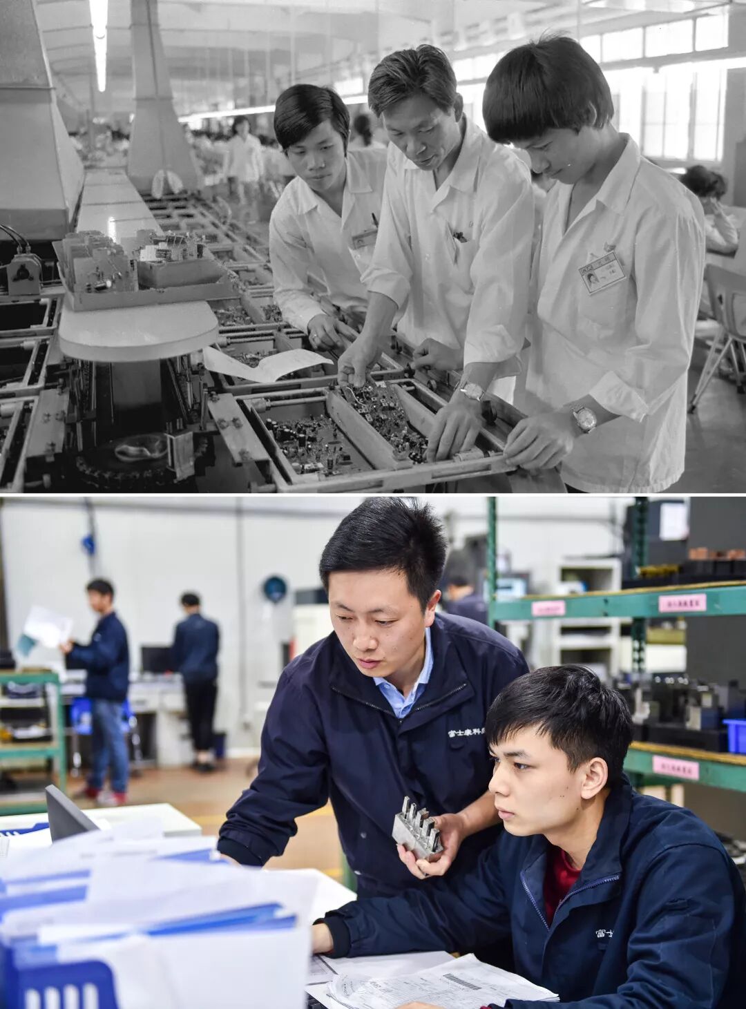 拼版照片:上图为深圳沙河光明华侨电子厂(资料照片);下图为富士康科技集团深圳观澜科技园区的厂房(2018年)。