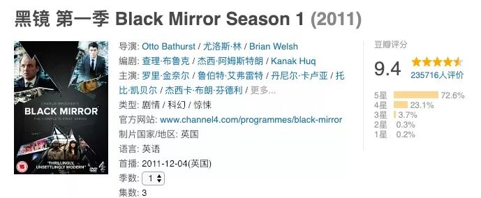 - 如果你是科幻迷,《黑镜》无疑是不得不看的神剧。《黑镜》擅长以极端的黑色幽默讽刺和探讨科技对人类生活产生的影响,2011 年开播的第一季豆瓣评分如今仍然高达 9.4 。 可自从 Netflix 接手制作