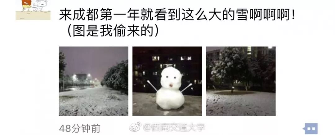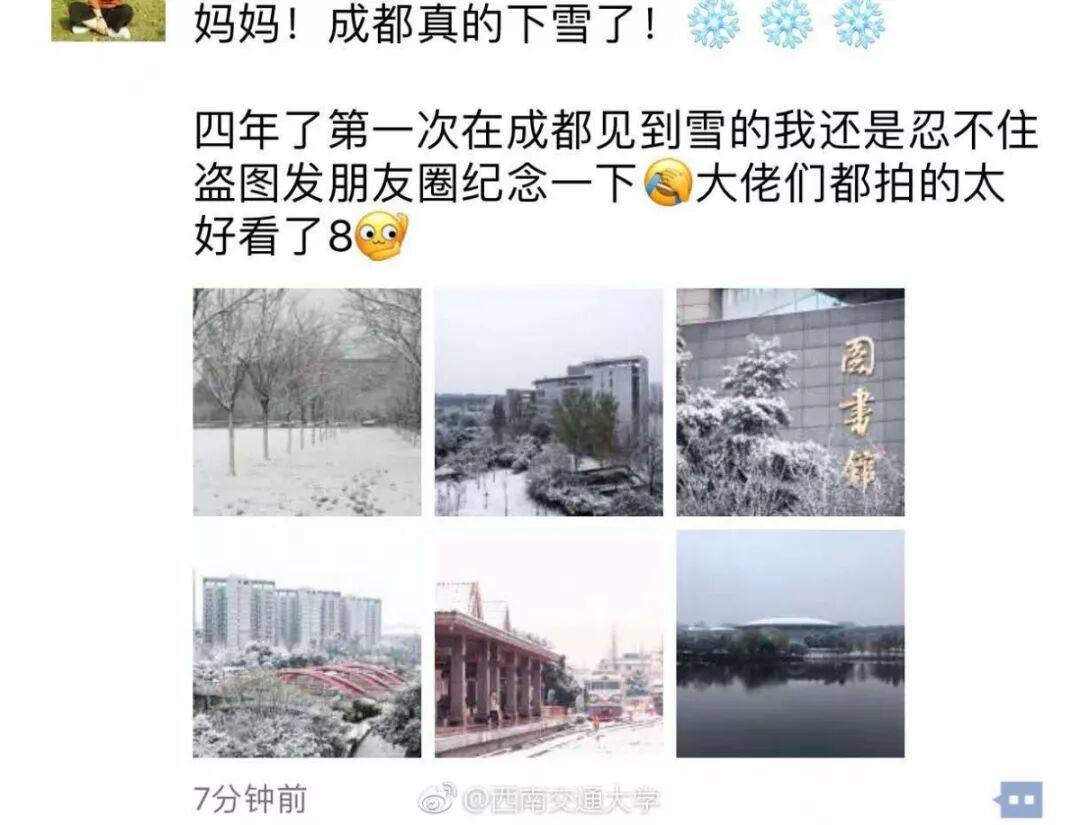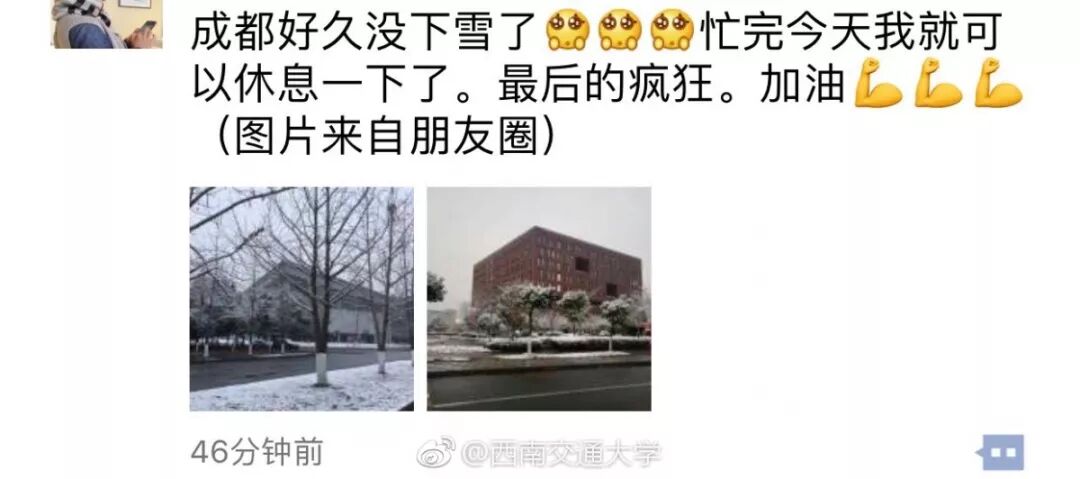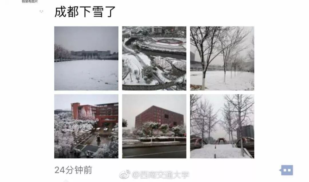 - 出生在南国温柔时光里的你是否也曾幻想, 在某一个冬日清晨,揉着惺忪的睡眼, 一抬眸, 却惊喜而又意外地望见漫天飞雪和银装素裹的交大? 那来自遥远北国的你是否也曾憧憬, 在某一个平凡冬日,行走在蓉城,