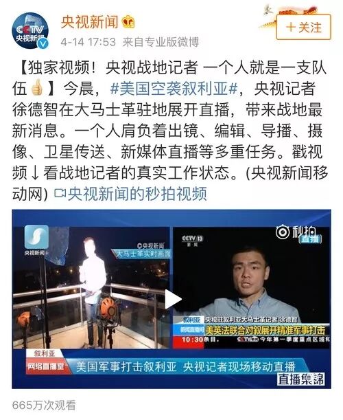 在全媒体语境下,新闻人同样需要掌握“十八般武艺”:从基础的采写编评,再到出镜、摄像、导播、后期等一系列流程,只有用户想不到,没有新闻人自己不能做的。2018年4月14日,央视记者徐德智在大马士革驻地进行战地直播时,一个人同时担任出镜记者、编辑、导播、摄像、卫星传送工程师、新媒体直播等多重任务,一个人就是一支队伍。