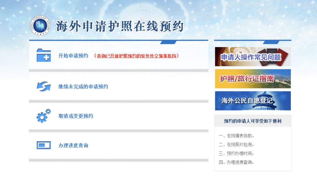 △2016年,“海外中国公民护照在线预约系统”(网址:https://ppt.mfa.gov.cn)正式启用。海外中国公民可以通过该系统,在线预约护照、旅行证申请,并在系统中自行选择受理馆别、填写表格、提交照片并预约办理时间。