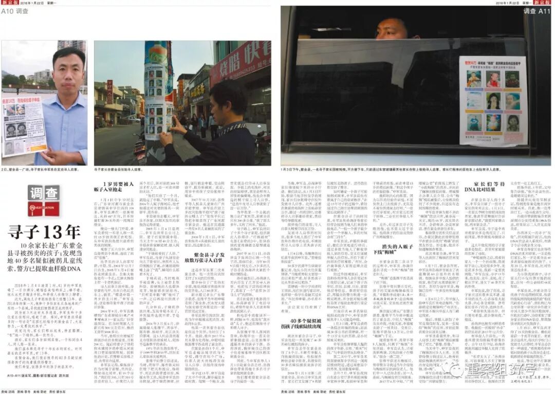 申军良:2018年我跑了4趟广东,加起来占了半年左右时间。我们这些家长中,谁这段时间不是很忙,就到紫金县发寻人传单。有人举报线索,我们就去看,去蹲点,把掌握的情况交给警方。