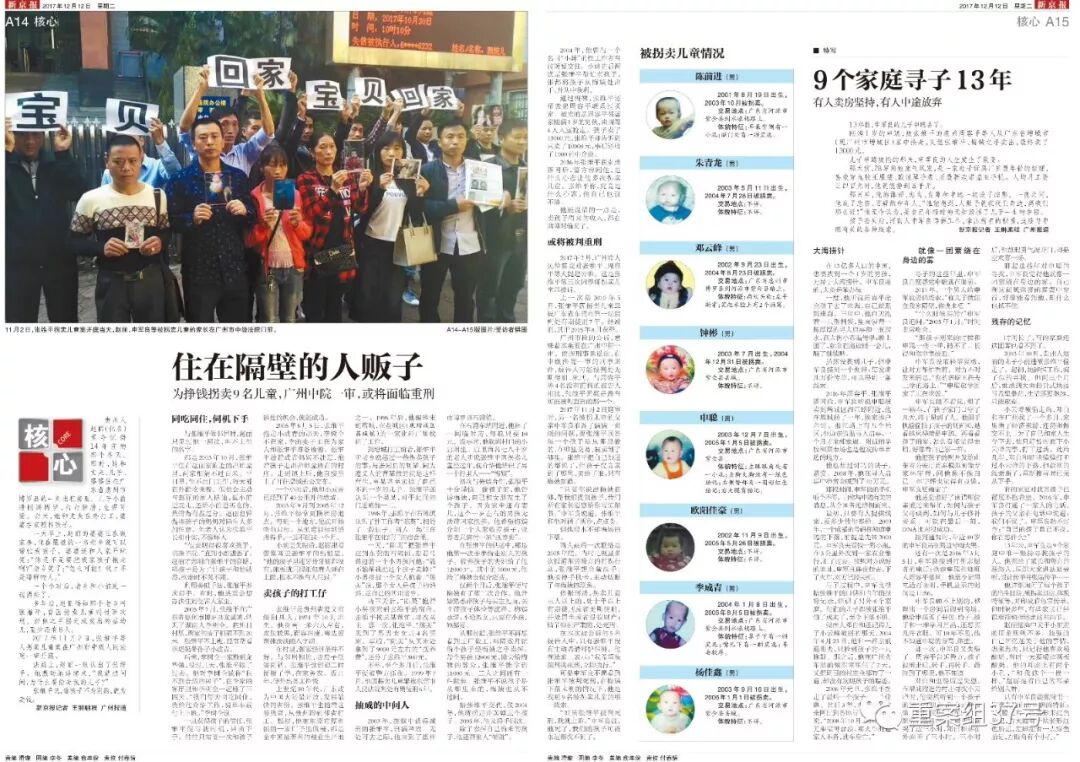 “我一直强忍着泪水听完宣判,差几天就是我儿子申聪被人贩子入室抢走14年了。”被拐幼儿家长申军良说,“十四年了,谁能知道我们内心有多么的痛苦?没找回孩子之前,也许重判人贩子是对我们内心最大的安慰。”