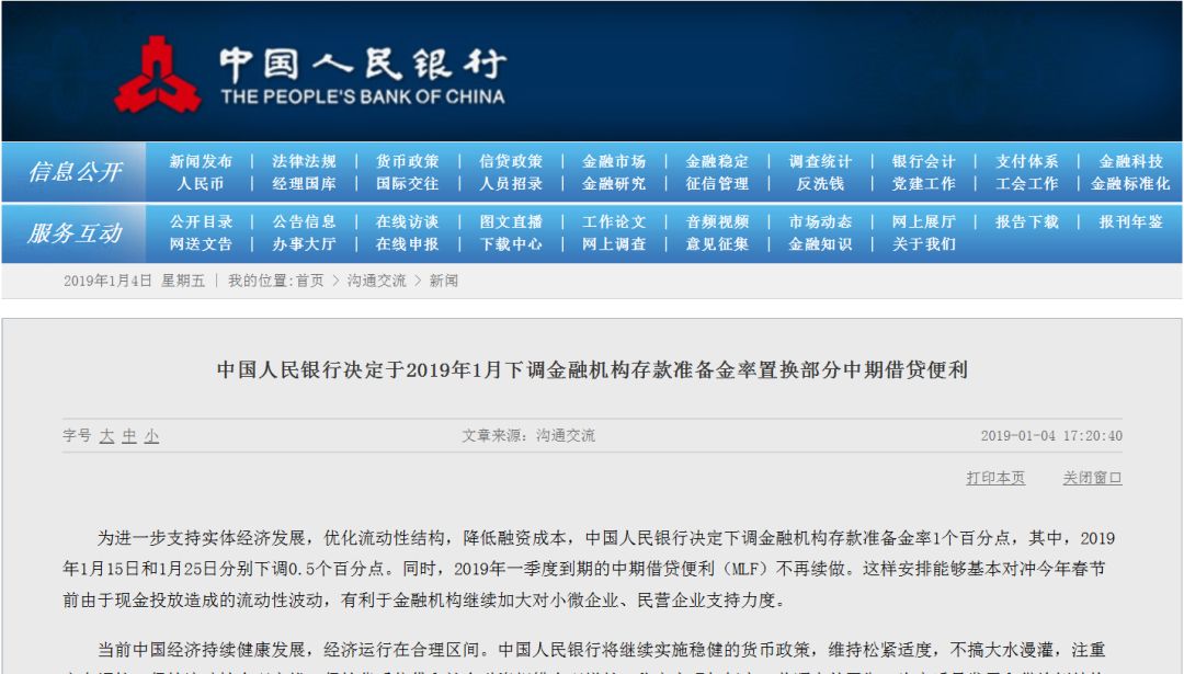 央行决定下调金融机构存款准备金率1个百分点,其中,2019年1月15日和1月25日分别下调0.5个百分点。同时,2019年一季度到期的中期借贷便利(MLF)不再续做。(解读)