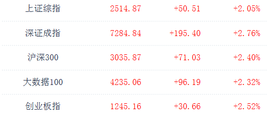 昨日三大股指全线大涨,截至收盘,沪指报2514.87点,上涨2.05%;深指报7284.84点,上涨2.76%;创业板报1245.16点,上涨2.52%。