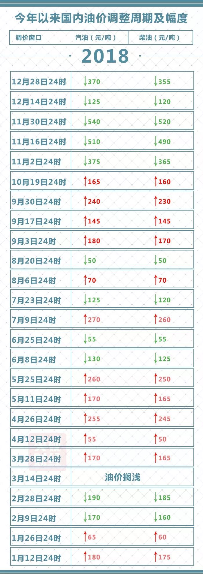年内油价变动一览:13涨11跌1搁浅