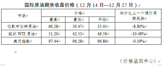 据国家发改委价格监测中心监测,本轮成品油调价周期内(12月14日—12月27日),国际油价大幅下降。伦敦布伦特、纽约WTI油价平均比上轮调价周期下降9.64%。