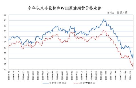 因市场对全球经济增长悲观预期加剧,原油供应出现过剩迹象,美国股市多个交易日大幅下跌,从本月中旬开始,国际油价再度快速下降。一是全球经济前景低迷,贸易和金融形势不稳,地缘政治风险上升,国际能源署和美国能源信息署近期纷纷下调2019年全球原油需求增速预估。二是美国等主要产油国供应增速加快,而库存数据上升。12月24日,伦敦布伦特、纽约WTI油价分别降至每桶50.47美元、42.53美元,较10月初的高点分别下降36美元、34美元,降幅超过40%,均回落至一年多来的最低位。