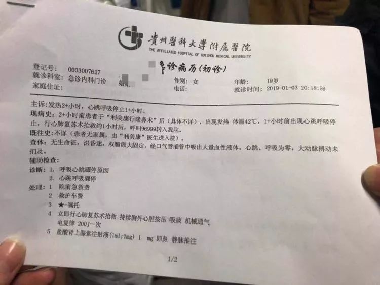 1月3日下午1点,贵阳19岁大二女学生夏某某被推进贵阳利美康整形外科医院手术室进行隆鼻手术,原本4小时左右结束的手术,家属在7小时后被通知,夏某某在贵州医科大学附属医院救治无效死亡。