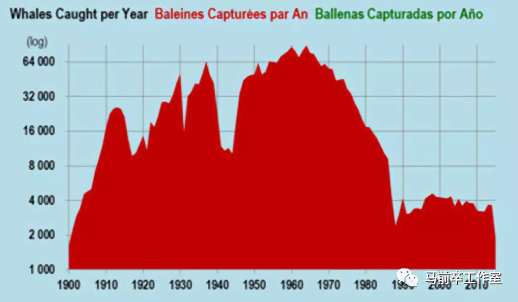 20世纪以来人类捕鲸数量的变化 最后的曲线几乎是日本独力支撑