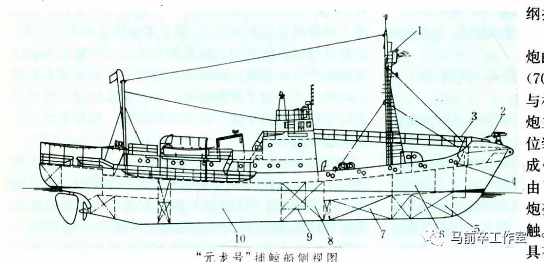 中国第一艘自主建造的捕鲸船“元龙号”侧视图,可以看出其外形结构已经具备典型的现代捕鲸船特征。