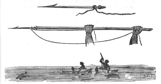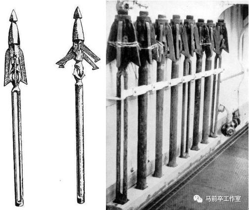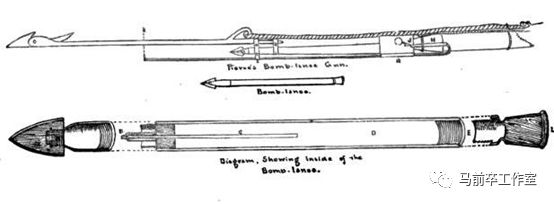 普通鱼叉(上)和一种早期的爆裂鱼叉示意图(下),后者由英国人威廉·康格雷夫(William Congreve)发明于十九世纪二十年代,相当于在普通鱼叉上捆绑了一个碰撞触发的火箭推进器来增加威力。同一时期前后还有许多人发明了其他制式的爆裂鱼叉。