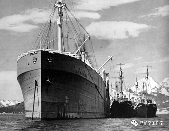 重达数千乃至数万吨的鲸工船,是船队的指挥中心和鲸体加工处理的海上基地,也是一座名副其实的“海上工厂”:强大的绞机把捕鲸船捕获的鲸鱼沿着滑道拖上甲板,鲸体在那里被专门工具分解,之后,鲸肉、骨头和鲸皮等再被分别送往船上的制罐头、鲸骨粉、鲸油的加工制造车间。