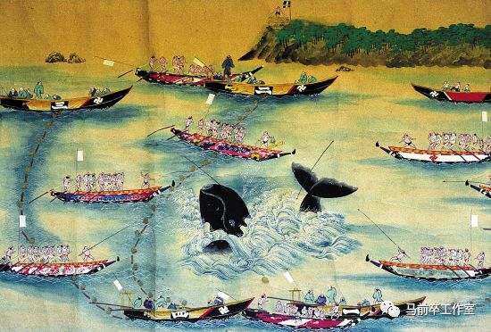 日本原始捕鲸的历史不短。大规模、有组织的捕鲸记录最早则是出现在室町时代(1336年-1573年)的末期。浮世绘表现了日本传统的捕鲸方式:在近海浅滩中使用敷网和刺网缠络住鲸,然后再以大、小铦射杀。据推断,15世纪日本每年狩猎鲸鱼的数量大约是800头上下。