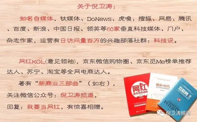 点击,订购倪卫涛“新商业三部曲”。(《互联网+风口》洞见实体产业和虚拟产业融合和升级的大风口,剖析互联网+商业模式和互联网+ 时代媒体、社交、电商、智能终端、金融、O2O、运营商……全行业产业格局和趋势;《媒体+时代》全面阐述网红造星模式,实例剖析泛娱乐时代的商业模式、媒体+、内容创业、社群经济、跨界攻略,预见未来商业经济新形态;《网红是怎样炼成的(案例版)》,20类超级网红心路历程,100名知名网红。
