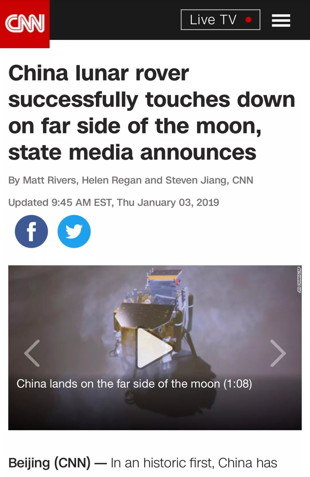 美国有线电视新闻网(CNN)也报道了此次成功的着陆,称其在人类太空探索历史上具有里程碑式意义。美国太空专家琼·弗里兹(Joan Johnson-Freese)在该媒体上表示,中国在太空领域的此次成功引人注目。嫦娥探测器的成功月背着陆加上此前神舟飞船的成功发射,这两项太空行动加在一起很可能让中国实现载人登月的计划。下次从月球传输回地球的声波很可能将是中文。