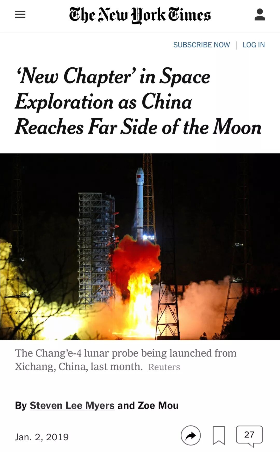 《纽约时报》以“中国开启太空探索新篇章”为题,回顾了中国近20年来在太空探索领域取得的多项重大成就,称无论在技术和象征意义的层面上,这次的月背软着陆都是一项重大成就。为美国国防部密涅瓦研究所撰写太空研究报告的独立分析师纳姆拉塔·戈斯瓦米(Namrata Goswami)表示,中国将此次登月作为基石,为未来的载人登月做准备。中国的长期目标是让人类移居月球,嫦娥探测器正在探索的地方可能会成为未来的燃料补给基地。