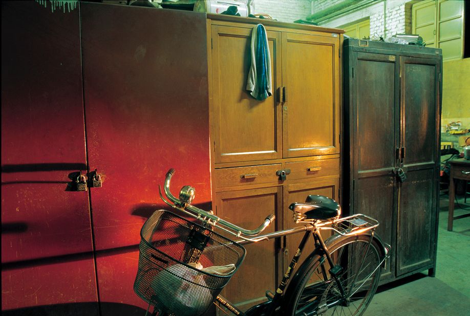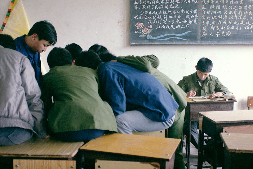 那期间我做了大量的摄影实验,其实就是解决“我们”这个问题。首先拍了许多小孩,想拍小学生,但他们太小,不成一个独立的思想,不过瘾;拍大学生呢,也不是我心中那种传统的大学,不纯粹;后来我发现,中学作为人的一个阶段,相对来说还算完整,就这么选了中学生。我最喜欢那张,几个男生坐在桌子上,穿着军绿的上衣,那青春的荷尔蒙呼呼地,就觉得那个现场我能进去,我还能出来,有人的味道,气息特别浓。