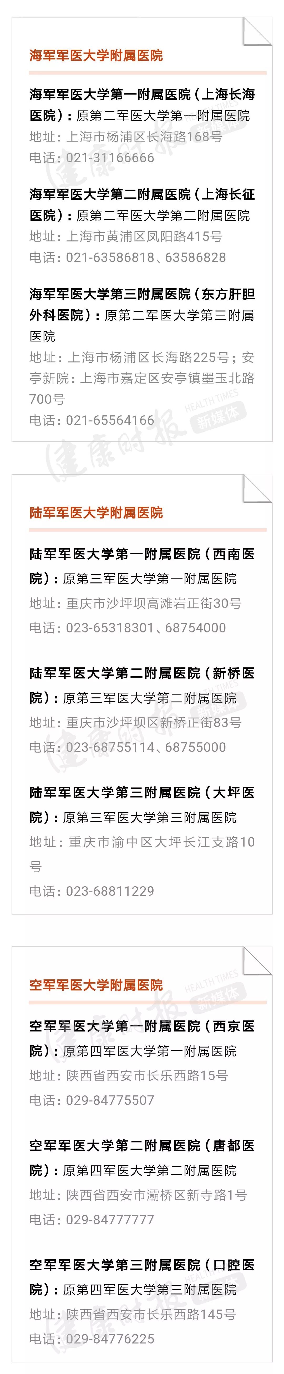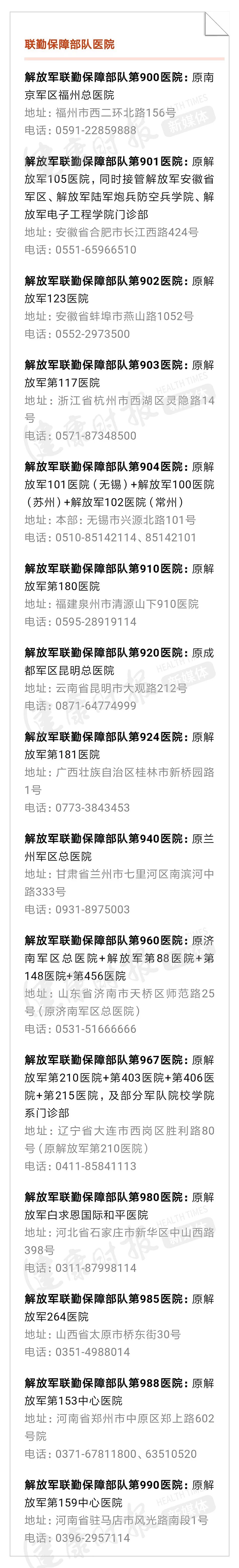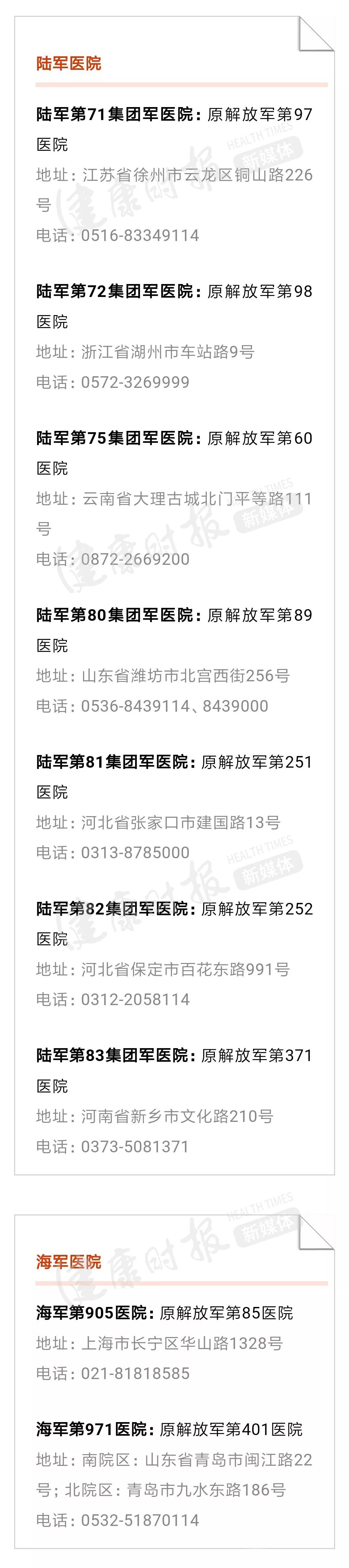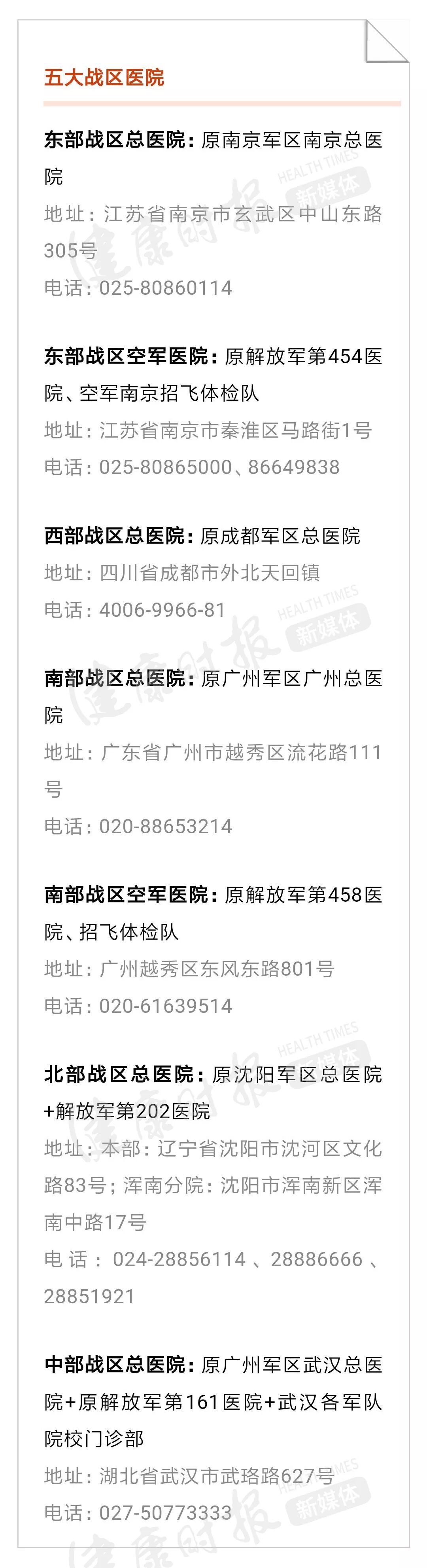 注:各个医院的地址、电话均来自于医院网站等公开信息。本文为不完全名单,未来或有更多军队医院改名字,健康时报新媒体部也会持续关注,为大家提供服务信息!