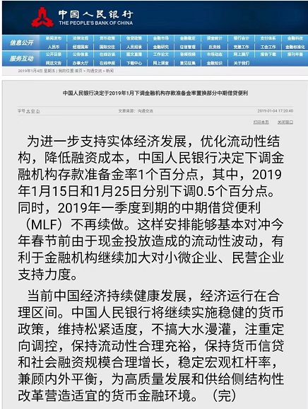 中国人民银行决定于2019年1月下调金融机构存款准备金率置换部分中期借贷便利:下调金融机构存款准备金率1个百分点,其中,2019年1月15日和1月25日分别下调0.5个百分点。同时,2019年一季度到期的中期借贷便利(MLF)不再续做。