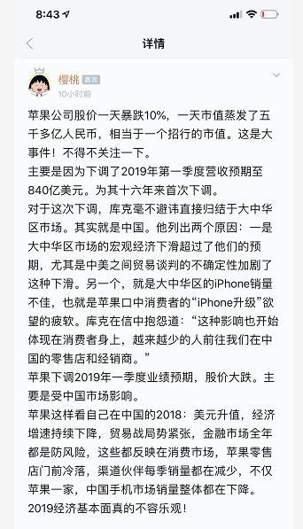 今天樱桃在星球还发了一条信息,就是苹果股价大跌,因为下调中国业绩预期,手机销量下滑,平常我都不关注科技和股票的,但这次为什么要关注呢,因为以小见大,这背后体现的是中国经济基本面的变化,不容乐观。