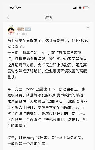 当然我不是真的瞎预测,信号就是来自总理说的话,中国政府网今天报道了几句话,总理提出要运用好全面降准、定向降准工具,支持民营企业和小微企业融资。我是看到券商中国的报道后,马上在朋友圈和知识星球传递了信号。