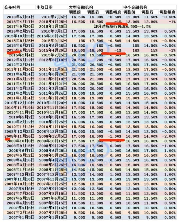 大型金融机构全面降准降1个百分点的,十年来,也就是08年金融危机后发生了一次,2015年4月在楼市放松调控后有一次,当时也是经济的低谷期,然后就是今天这一次,而2018年4月都只是定向降准。