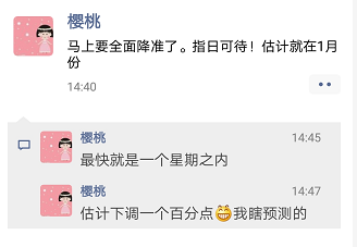 先吹个牛逼,今天下午2点40,我微信朋友圈发了条信息,预感央行马上要全面降准了,最快一个星期落地,估计下调存款准备金一个百分点。