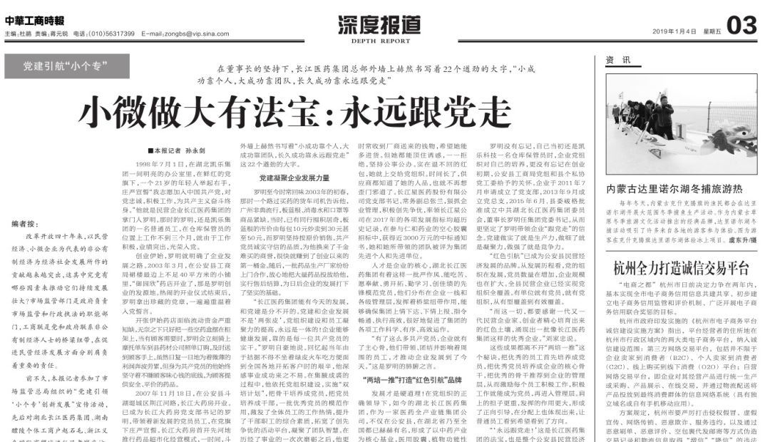 前不久,中华工商时报@全联通(cbtqlt)记者参加了市场监管总局组织的"党建引领`小个专`创新发展"宣传活动,先后对湖北长江医药集团、湖南醴陵个体工商户赵石毛、浙江义乌国际商贸城进行了考察采访。通过对一家小微企业成长起来的医药企业集团、一家最能代表中国草根经济的个体户、一家全球最大的小商品批发专业市场的采访和考察,记者发现党的组织、党员员工在小微企业、个体工商户和专业市场的发展过程中发挥了至关重要的作用。今天起,中华工商时报将陆续刊登对上述采访对象的报道。