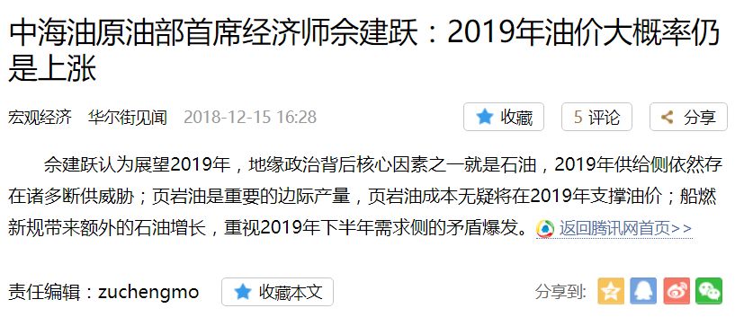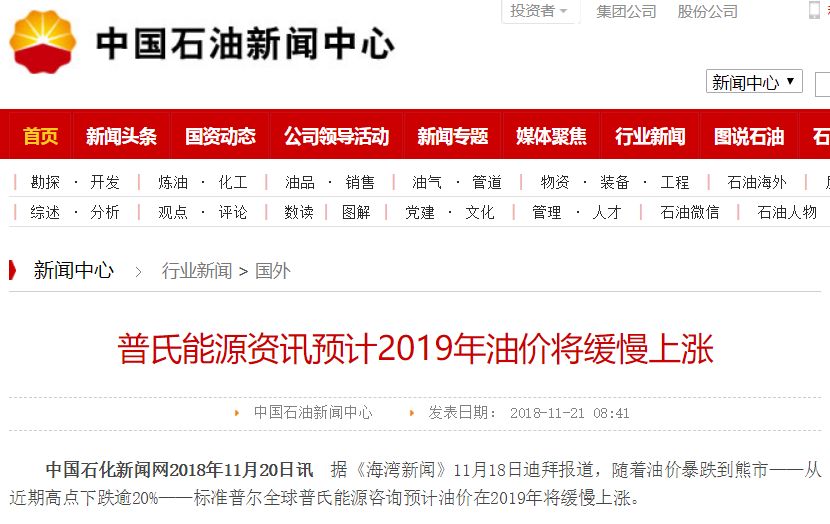 对于新的一年油价预测,中石油的态度相对保守,只在自家官网中国石油新闻中心上转载了一篇“普氏能源资讯预计2019年油价将缓慢上涨”的文章。