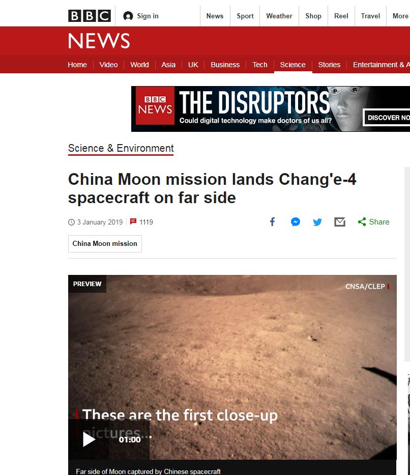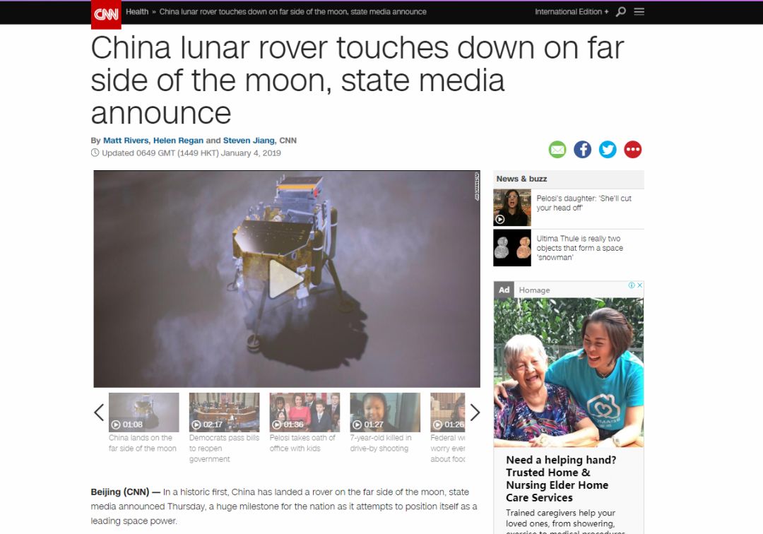 嫦娥四号成功实现月球背面软着陆的消息也登上了BBC、CNN等众多海外主流媒体的头版头条。