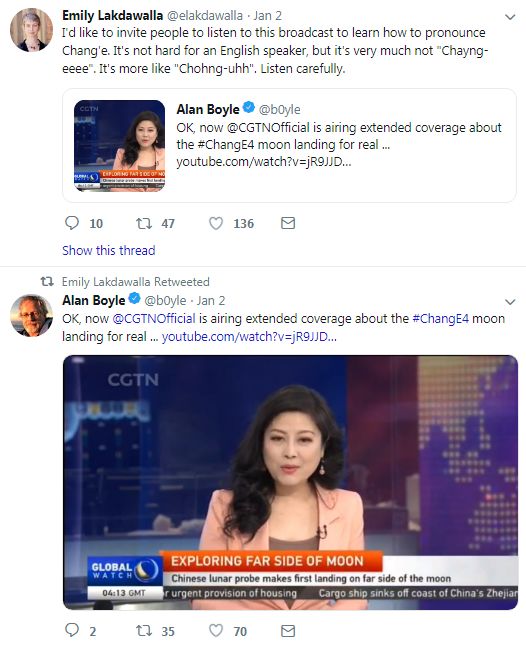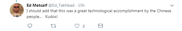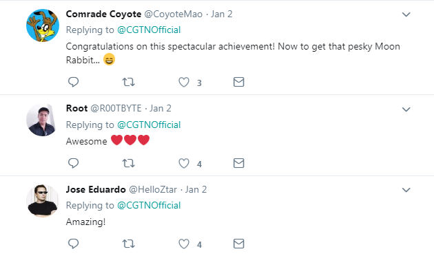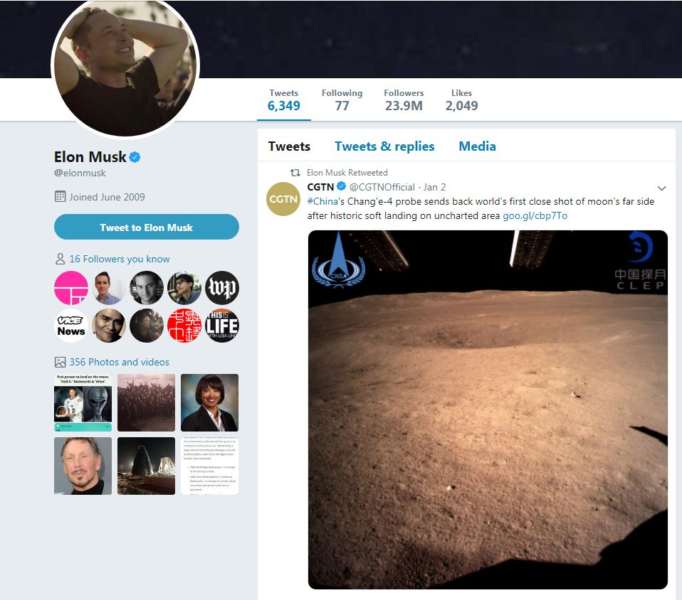 美国SpaceX创始人Elon Musk先是在新华社推特帖文下留言“祝贺!(Congratulations!)”之后又转发了CGTN推特账号发布的“嫦娥四号传回世界首张近距离拍摄月背影像图”帖文,显示出了对嫦娥四号任务的极高关注。