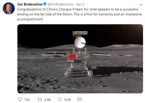 美国航天局局长Jim Bridenstine第一时间发推表示祝贺: