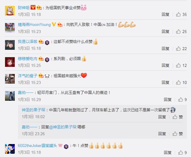 昨日,嫦娥四号成功落月的消息让国人沸腾,网友纷纷为我国航空航天事业取得的这一伟大成就点赞!![]()