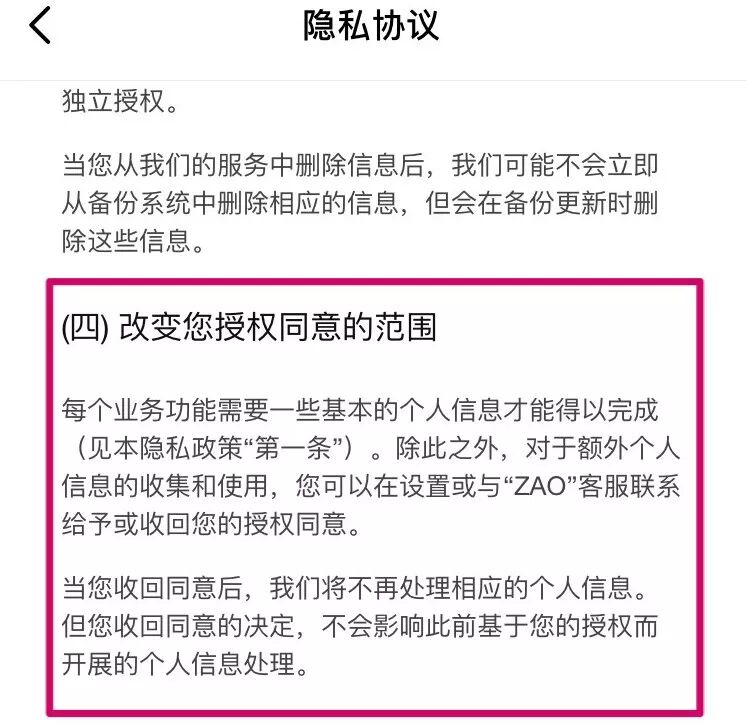 如果您把用户内容中的人脸换成您或其他人的脸,您同意或确保肖像权利人同意授予“ZAO”及其关联公司全球范围内完全免费、不可撤销、永久、可转授权和可再许可的权利,包括但不限于:人脸照片、图片、视频资料等肖像资料中所含的您或肖像权利人的肖像权,以及利用技术对您或肖像权利人的肖像进行形式改动;