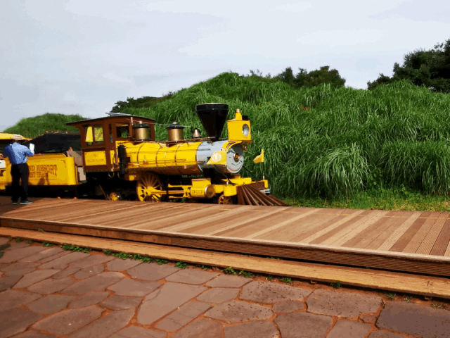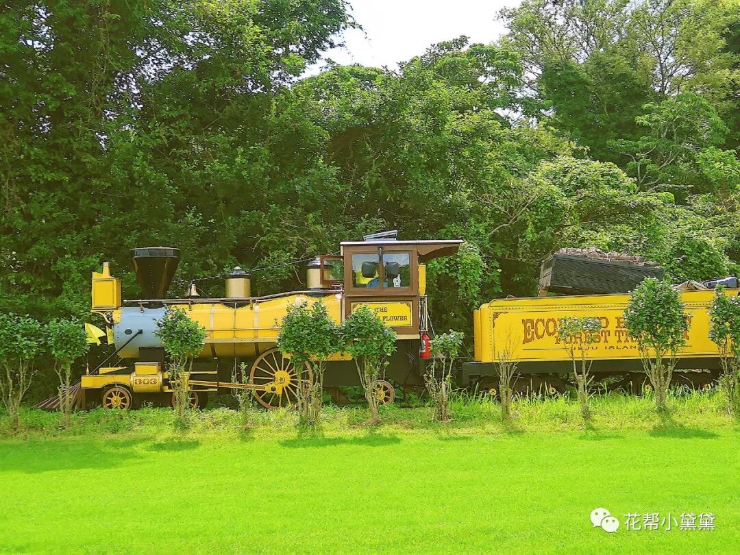 园区内有五部小火车,造型复古可爱,分别漆上济州岛最具代表性的五种生态色彩,红色代表火山,黑色为玄武岩,黄色是油菜花,绿色象征绿地,蓝色则为蓝天。