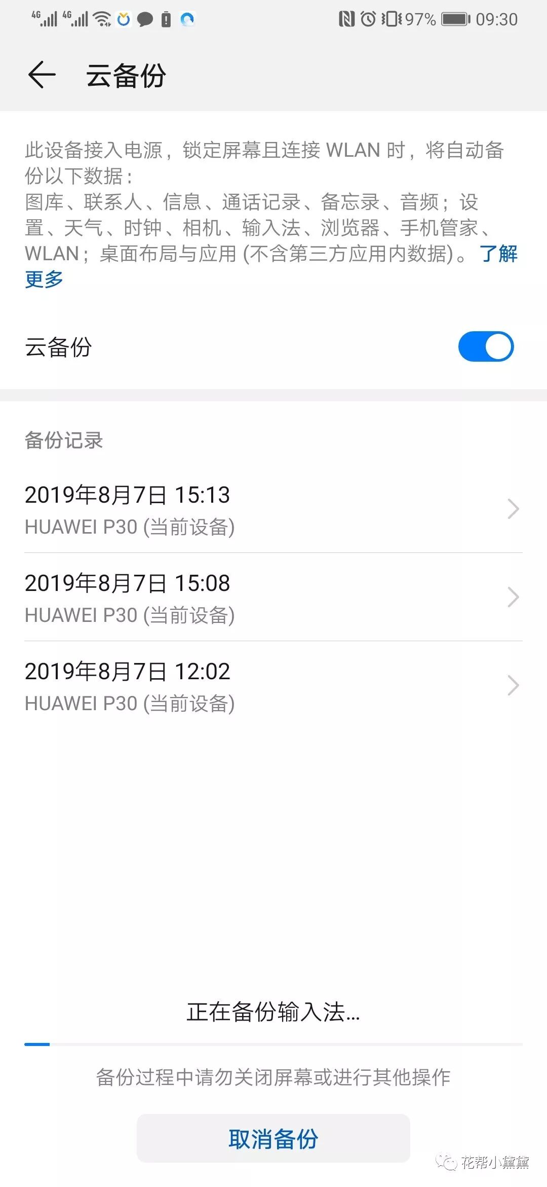不过自从知道了华为手机有自带的云空间功能就没再怕了,简单三个步骤:1、点击设置,登陆华为账号;2、点击进入云空间;3、云备份功能就会自动生效啦,所有照片和视频都会自动上传到云端,超级方便!