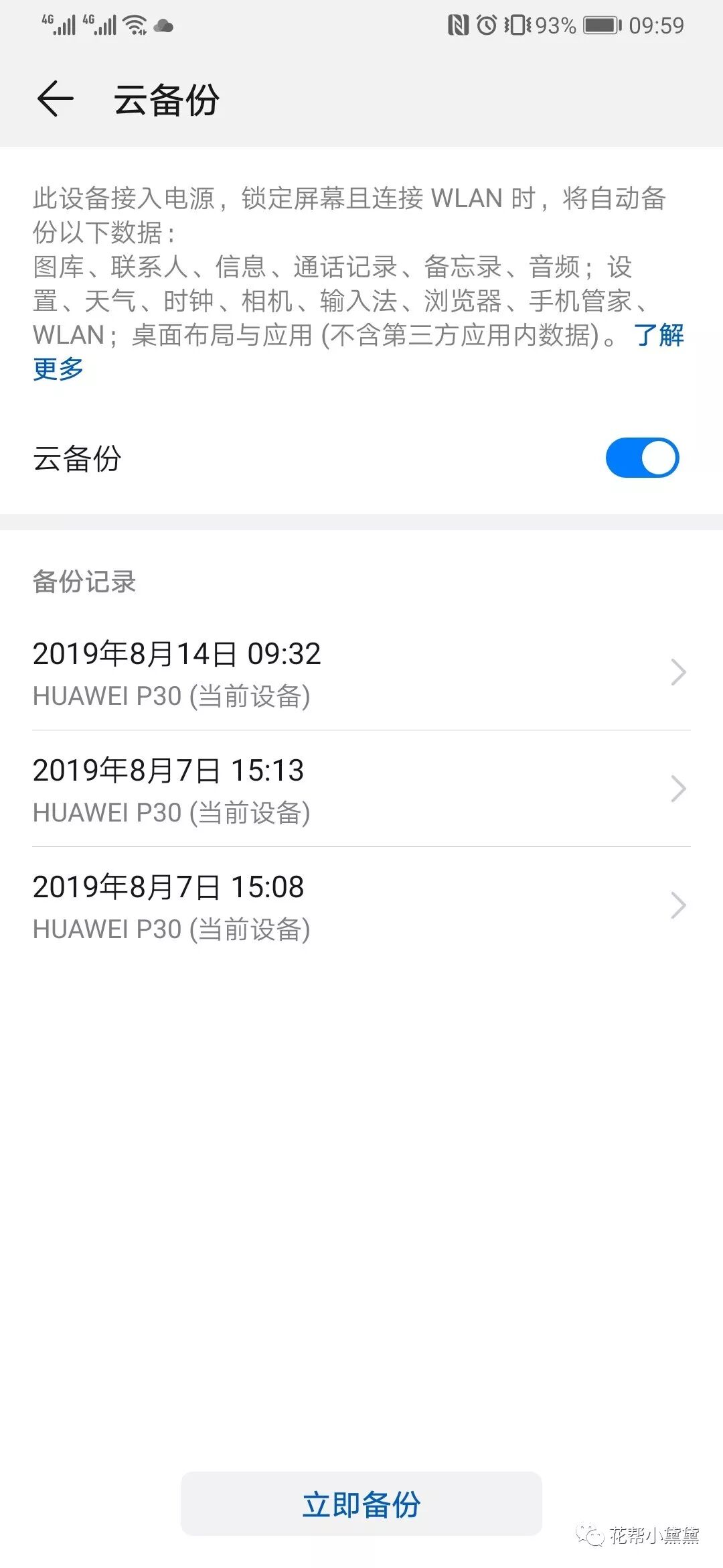 像我一样比较没有安全感的人,也可以手动实时备份,点击手机中的“立即备份”按钮就可以即刻备份啦,备份完成后,新的备份记录会出现在“备份记录”中,这样就可以做到记忆不丢失啦~~