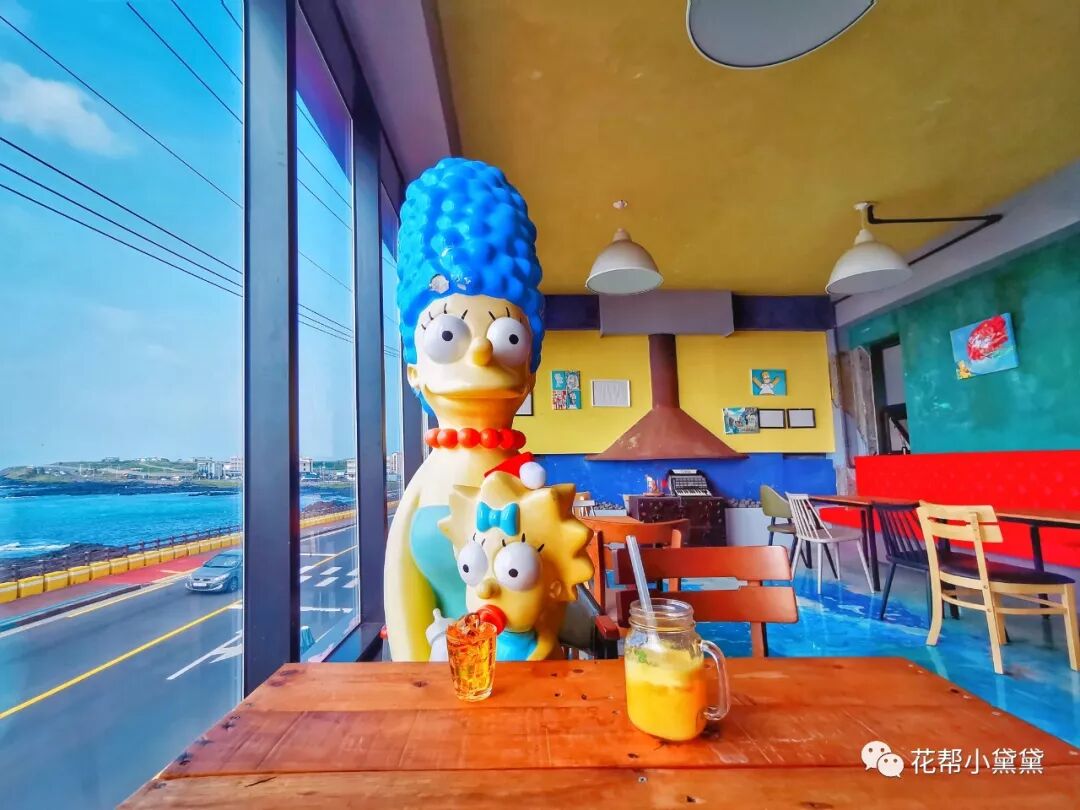 店里有很多辛普森的周边很可爱,还有两只大金毛🐶和一只小黄猫🐱,巨大的落地窗,无论坐在哪个角度都可以看到海,不同于济州岛其他海边咖啡馆游人如织的热闹光景,这家店人不多,整个空间都充满了温柔的黄色腔调,是能治愈旅途疲惫的惬意地方。