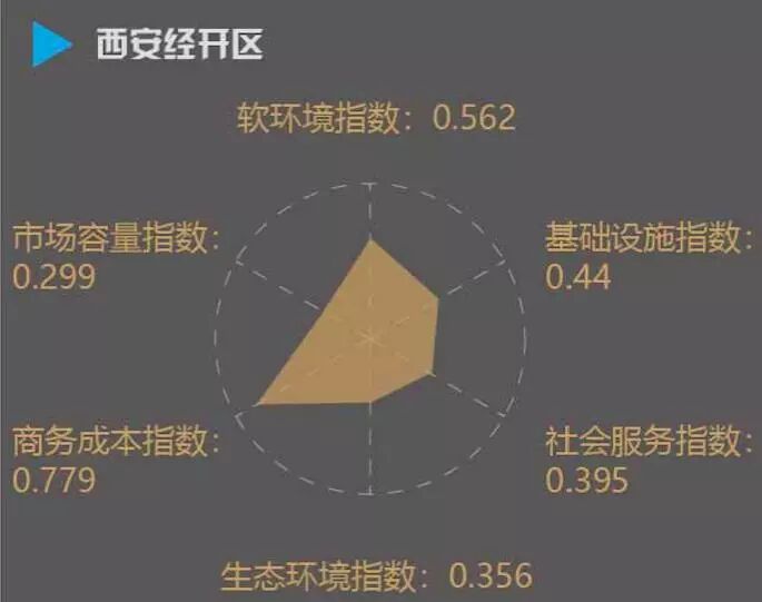 在本报告的营商环境测评中,西安经济技术开发区的营商环境指数位列第四。具体来看,在软环境指数方面,西安在30个经开区中名列第2,社会服务指数位列第3,商务成本指数第9,基础设施指数、市场容量指数和生态环境指数则分别位列第10,第19和第25名。