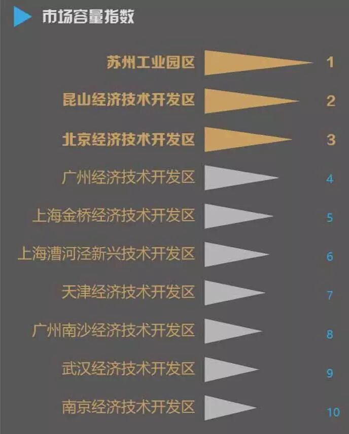 数据显示,苏州工业园区市场容量指数居首。其后则是昆山经开区、北京经开区、广州经开区、上海金桥经开区、上海漕河泾新兴技术开发区、天津经开区、广州南沙经开区、武汉经开区和南京经开区。