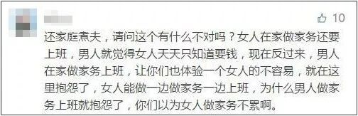 “还家庭煮夫?请问有什么不对吗?女人在家做家务还要上班,男人就觉得女人天天只知道要钱,现在反过来,男人做家务上班,让你们也体验一个女人的不容易,就在这里抱怨了……你们以为女人做家务不累啊?”
