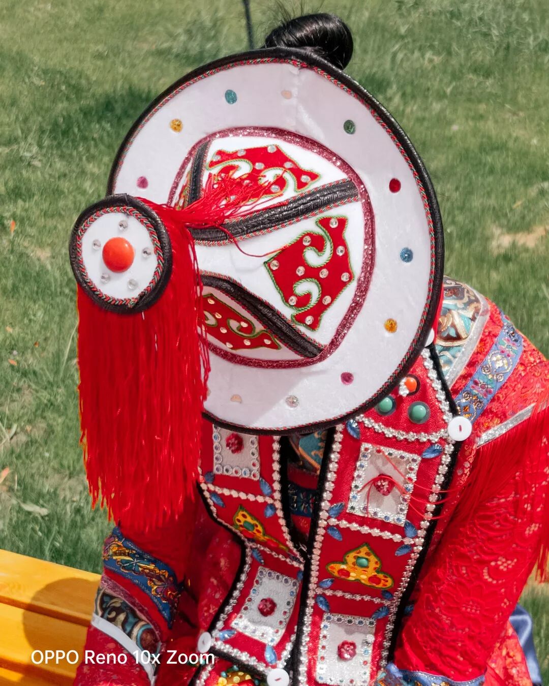 只见23岁的裕固族姑娘玛尔简吉斯扮演少女时代的新娘,她身着红色高领偏襟长袍,头戴一圈缀有珊瑚珠的红带子,下边缘上饰有由红、黄、白、绿、蓝五色珊瑚和玉石串成的珠穗,齐眉垂在前额,显得十分俏丽。