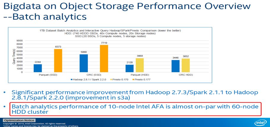 既然是闪存峰会,我必然也会分享一下Intel最新的全闪存S3A的测试结果,看看作为Hadoop后端存储,全闪是否还有优势,大家不要错过哦。