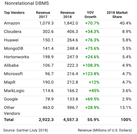 其实,从Gartner的统计数据看,Cloudera、Hortonworks和MapR去年的收入都在增长,只是增长不太高。大家可以看到,增长最高的基本都是公有云玩家,还有华为(也有公有云,但规模较小),MongoDB。