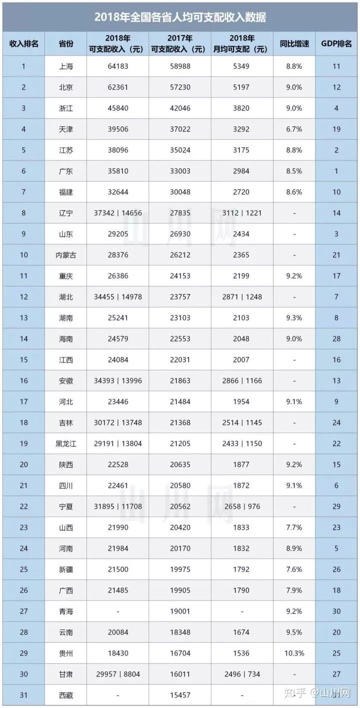 下面是2018年,大陆省级单位人均可支配收入列表。