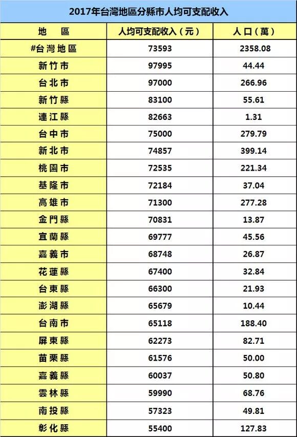 香港2016年人均可支配收入14.3万人民币。台湾最早的是新竹9.7万人民币,上海是大陆第一城市6.4万人民币。