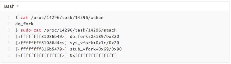 此时可以查看这个程序对应进程的waiting channel信息,/proc//wchan,表示当前线程D在这个函数位置。有时候可能是陷入内核互斥锁mutex,用户空间叫futex。造成进程D住的原因多种多样,需要结合搜索引擎具体情况具体分析。进一步还可以查看内核当前wchan的内核调用栈,/proc/