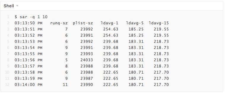 在/proc/loadavg伪文件中,内核还提供了一个nr_running(斜线前38)的值。这个值表示当前系统中正在进行中的R状态的线程数。linux的sar命令也对这个nr_running值进行了持久化的采集,即如下输出结果中的runq-sz列。